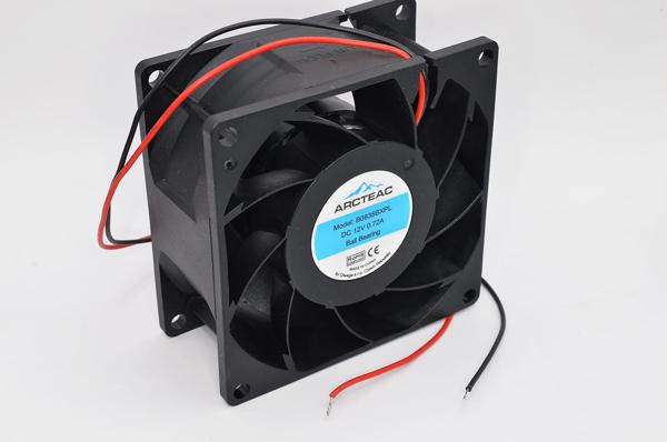 Вентилятор ARCTEAC B0838BXPL - осевой вентилятор с бесколлекторным DC мотором и двумя выходными проводами длиной 300 мм. Он имеет кубические размеры 80х80х38 мм и мощность 8,6 Вт. Вентилятор обеспечивает воздушный поток в 143 куб.м/ч при уровне шума 65 дБА. Ток питания достигает 0,72 А при номинальном напряжении 12 В и пусковом напряжении от 10 до 14 В. Вентилятор имеет качениевый подшипник и работает при температурах от -10°C до 70°C. Корпус и крыльчатка выполнены из термопласта. Скорость вращения составляет 5700 об/мин.