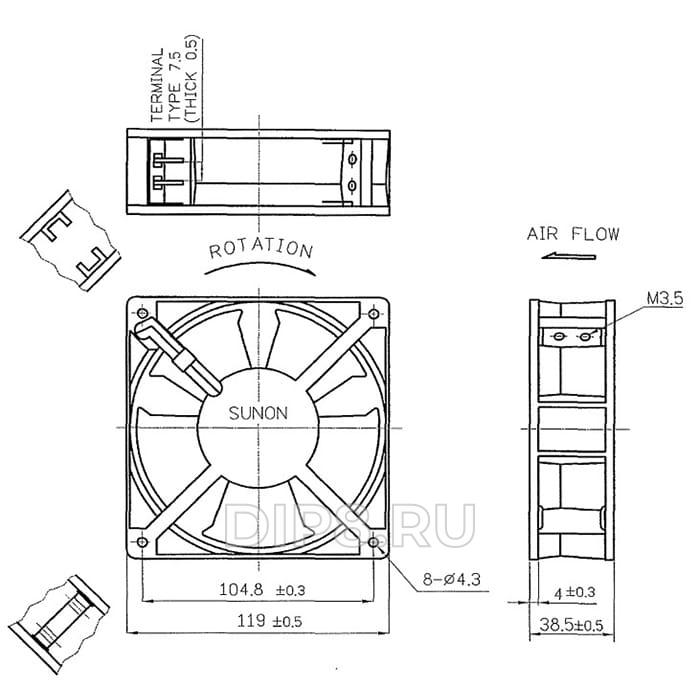 Вентилятор осевой, 230В AC, 120х120х38мм, подшипник качения, 93куб.м/ч, 28дБА