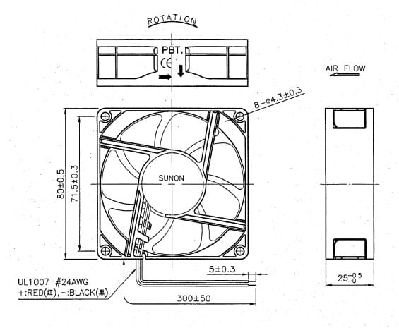 Вентилятор SUNON EE80252BX-A99 - это осевой вентилятор размером 80x80x25 мм с качением подшипником. Он обеспечивает воздушный поток 76,5 куб.м/ч при статическом давлении 57 Па. Ток питания составляет 0,08 А при напряжении 24 В, а потребляемая мощность – 1,9 Вт. Вентилятор работает на непрерывной основе со скоростью вращения 3 600 об/мин и уровнем шума 38 дБА. Корпус и крыльчатка изготовлены из термопласта, а длина провода составляет 300 мм. Минимальная рабочая температура составляет -10°C, а максимальная - 70°C.