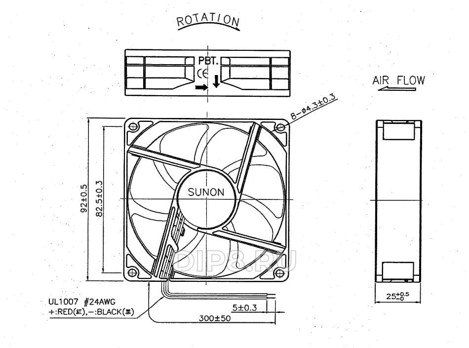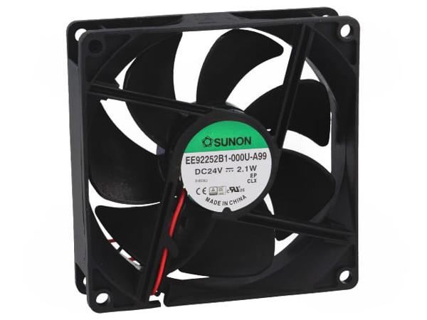 Вентилятор SUNON EE92252B1-A99 - это осевой вентилятор с воздушным потоком 87,55 куб.м/ч и статическим давлением 37 Па. Он имеет размеры 92х92х25 мм и имеет подшипник типа качения. Уровень шума составляет 34 дБА. Ток питания типа DC и номинальное напряжение 24 В. Пусковое напряжение 10 В, а максимальное рабочее напряжение составляет 27,6 В. Номинальный ток 0,087 А, а потребляемая мощность 2,1 Вт. Тип мотора бесколлекторный, скорость вращения 3 000 об/мин. Выводы два провода длиной 300 мм с диаметром 26AWG. Корпус и крыльчатка изготовлены из термопласта, класс изоляции E, сопротивление изоляции минимум 10 Мом. Минимальная рабочая температура -10°C, а максимальная 70°C.