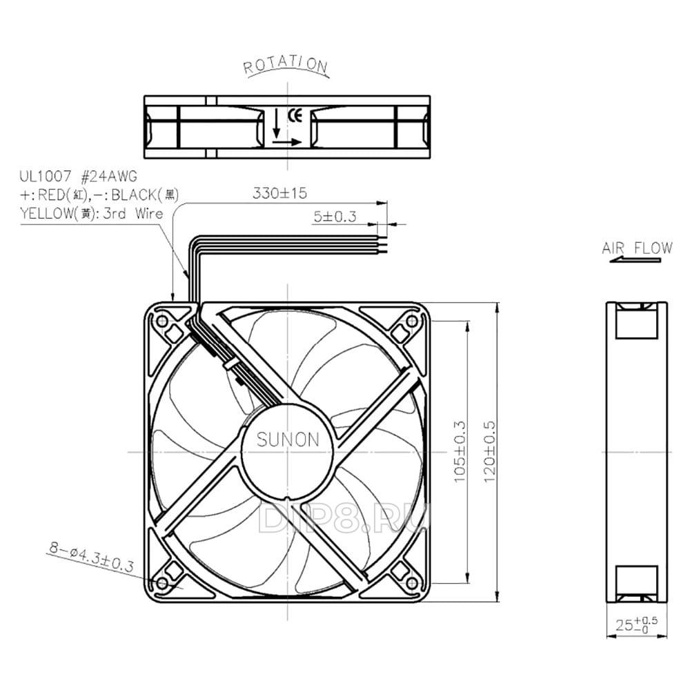 Осевой вентилятор SUNON EEC0251B1-G99 – это надежное и мощное устройство, обеспечивающее высокую производительность. Он имеет воздушный поток до 183,83 куб.м/ч и статическое давление до 70 Па. Длина, ширина и толщина корпуса составляют 120 мм, 120 мм и 25 мм соответственно. Вентилятор оснащен качениевым подшипником, имеет уровень шума 44,5 дБА. Для питания предусмотрено напряжение 12 В и ток 0,451 А. Мотор бесколлекторный, скорость вращения 3 100 об/мин. Выводы – 3 провода с длиной 300 мм и диаметром 28AWG. Материал корпуса и крыльчатки – термопласт. Класс изоляции E, сопротивление изоляции мин. 500 Мом. Рабочая температура от -10°C до +70°C. Особенности: сигнальный вывод типа F, автоперезапуск.