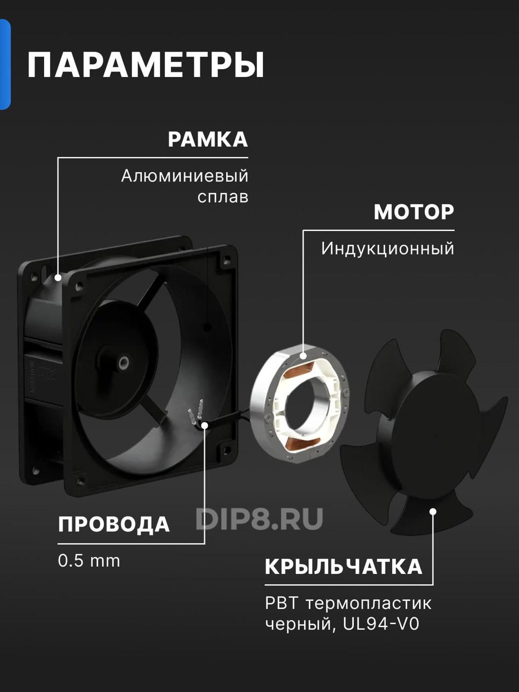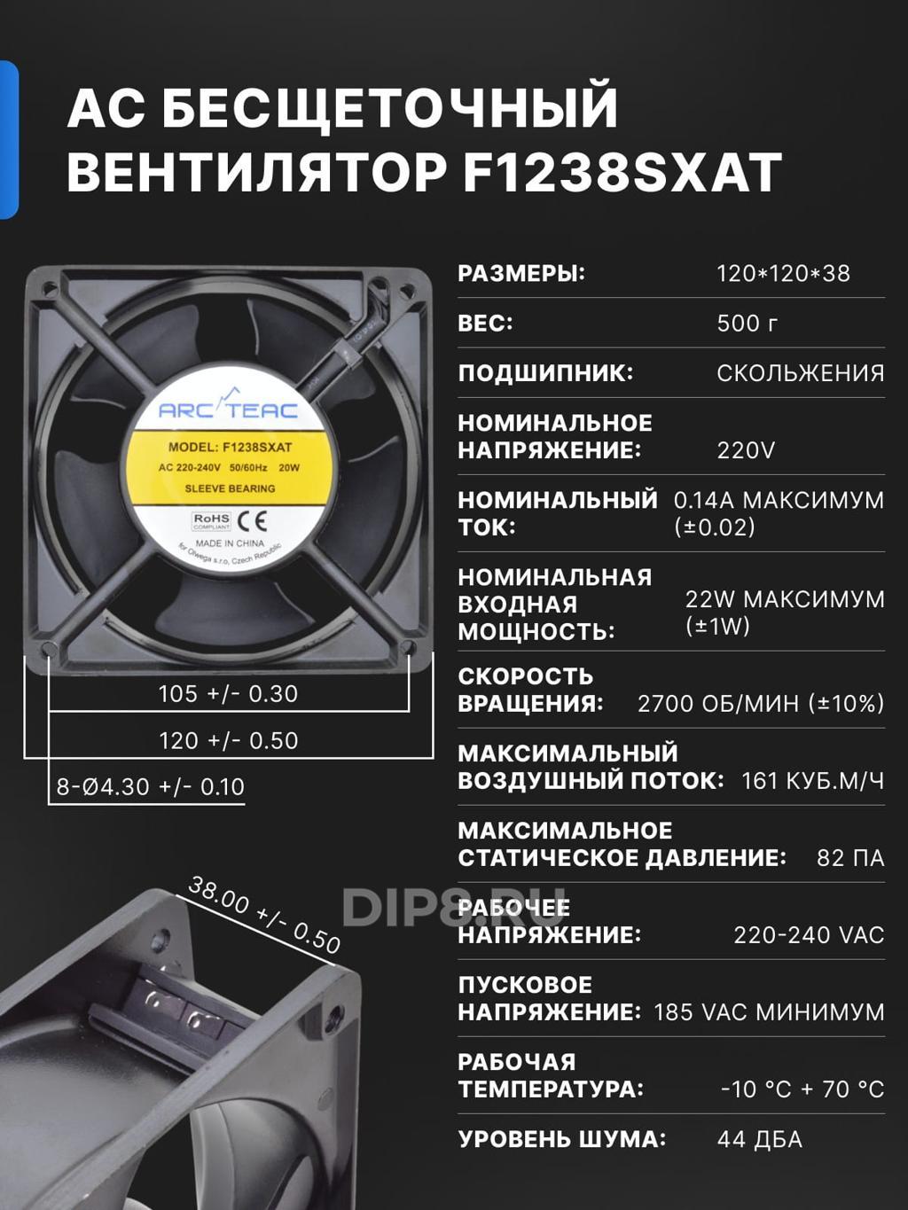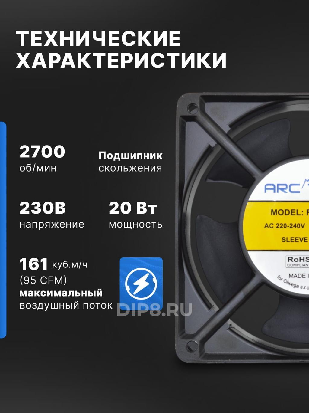 Вентилятор: осевой; 120х120х38 мм; 230 В AC; 0,14 А; 161 куб.м/ч; 20 Вт; подшипник скольжения; 2700 об/мин; клеммная колодка