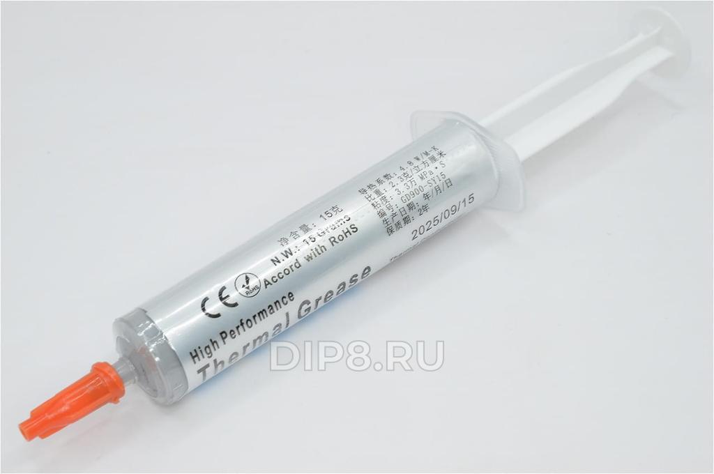 Термопаста: силиконовая; теплопроводность: 4,8 Вт/м·К; удельная плотность: 2,3; рабочая температура: от -50 до +200°С; упаковка: шприц; цвет: серый; вес нетто: 15 гр.