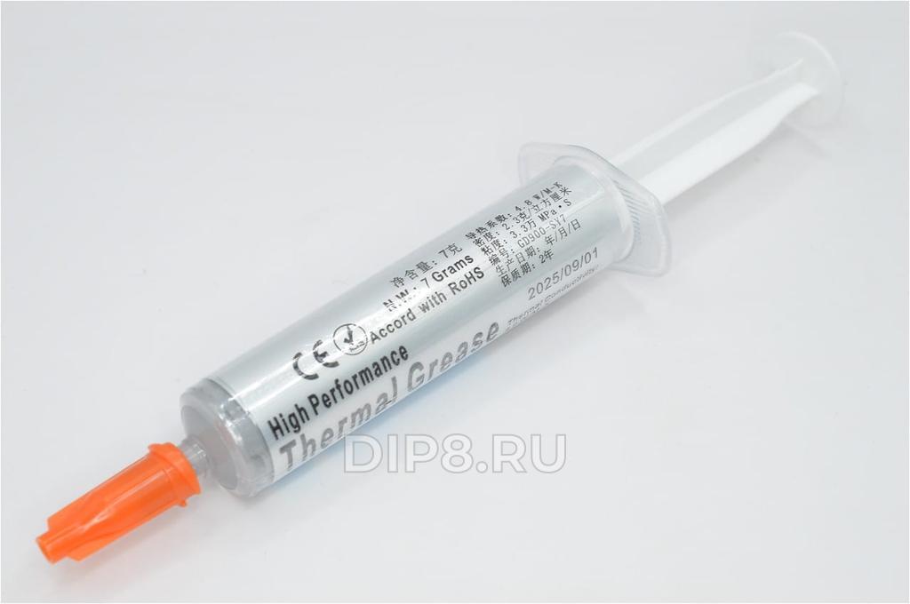Термопаста: силиконовая; теплопроводность: 4,8 Вт/м·К; удельная плотность: 2,3; рабочая температура: от -50 до +200°С; упаковка: шприц; цвет: серый; вес нетто: 7 гр.