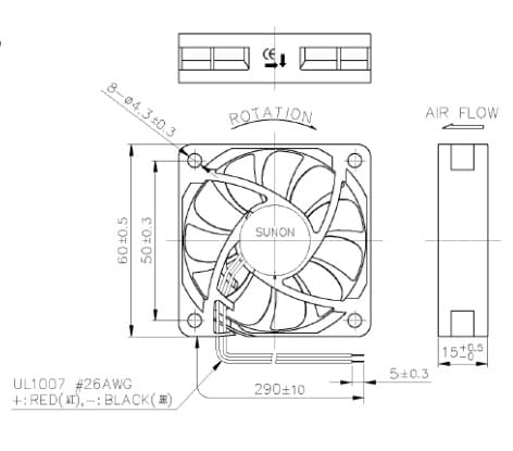 Осевой вентилятор SUNON HA60151V4-A99-A способен произвести воздушный поток до 21,46 куб.м/ч при статическом давлении 10,0028 Па. Вентилятор имеет размеры 60х60х15 мм и имеет уровень шума 14,5 дБА. Он работает от питания DC 12 В при токе 0,022 А и потребляемой мощности 0,27 Вт с допустимым отклонением потребляемой мощности и тока 15%. Тип мотора бесколлекторный, DC, скорость вращения 2 200 об/мин. Выходные провода с длиной 290 мм и диаметром 26AWG. Корпус и крыльчатка изготовлены из термопласта, имеют класс изоляции A и сопротивление изоляции мин. 10 Мом. Рабочая температура от -10 до 70 °C, подшипник типа Vapo.