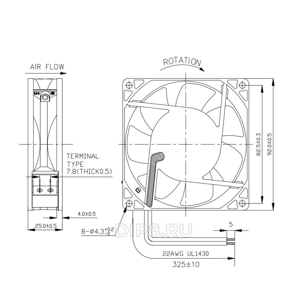 Вентилятор осевой, 92х92х25мм, 230В, AC, 0.05А, 10Вт, качения, 1500об/мин, коннектор