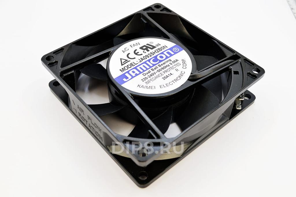 JA0925H2B0N-T представляет из себя осевой вентилятор переменного тока. В нем применяется подшипник качения, что позволяет использовать вентилятор в условиях повышенных температур. Длина вентилятора составляет 92 мм, ширина 92 мм, а толщина 25 мм. Номинальное напряжение питания 230 Вольт переменного тока при потребляемой мощности 10 Вт. Вентилятор создает максимальный воздушный поток 36. 3 кубических метров в час. При скорости вращения крыльчатки 1500 оборотов в минуту вентилятор вызывает уровень шума 16. 3 дБА. Данная модель применяется в диапазоне температур от -10 до 70 градусов Цельсия. В качестве материала корпуса вентилятора применяется алюминий, для изготовления крыльчатки используется термопласт. Вентилятор подключается к питанию через разъем.