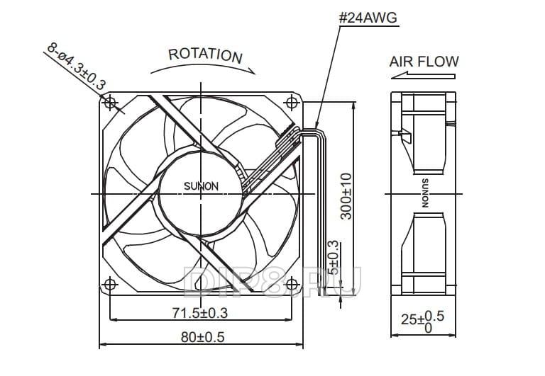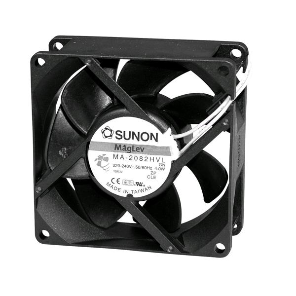 Вентилятор SUNON MA2082HVL – осевой вентилятор с воздушным потоком 67,1 куб.м/ч и статическим давлением до 35 Па. Имеет размеры 80х80х25 мм и высокотехнологичный подшипник Vapo, при минимальном уровне шума 32,8 дБА. Питание осуществляется от сети переменного тока AC с номинальным напряжением 230 В и номинальным током 0,1 А, потребляемая мощность составляет 3,8 Вт. Вращение мотора асинхронного типа происходит на скорости 3 200 об/мин. Для подключения имеются 2 провода длиной 300 мм и диаметром 28AWG. Корпус и крыльчатка изготовлены из термопласта, имеется класс изоляции E и минимальное сопротивление изоляции 10 Мом. Минимальная рабочая температура составляет -10°C, максимальная – 70°C. Для безопасного использования обеспечен автоперезапуск.