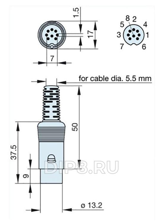 Вилка, DIN, "папа", PIN 8, конфигурация выводов 270°, прямой, на провод