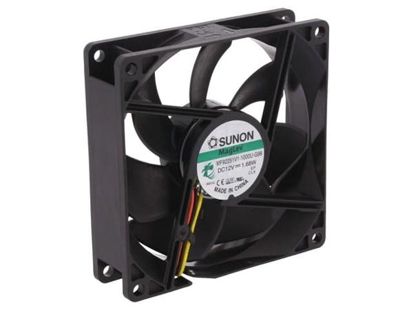 Вентилятор SUNON MF92251V1-G99-A – осевой вентилятор с потребляемой мощностью 1,68 Вт, который может работать от напряжения 12 В и тока 0,14 А. Он имеет воздушный поток 87,04 куб.м/ч и статическое давление 37,3633 Па. Размеры вентилятора составляют 92 x 92 x 25 мм. Уровень шума составляет 34 дБА. Вентилятор оснащен бесколлекторным DC мотором с максимальной скоростью вращения 3 000 об/мин. Для подключения имеется 3 провода с длиной 310 мм и диаметром 24AWG. Корпус и крыльчатка изготовлены из термопласта, сопротивление изоляции минимальное – 10 Мом. Диапазон рабочих температур – от -10 до 70 °C. Особенностью данного вентилятора является сигнальный вывод типа F и подшипник Vapo.