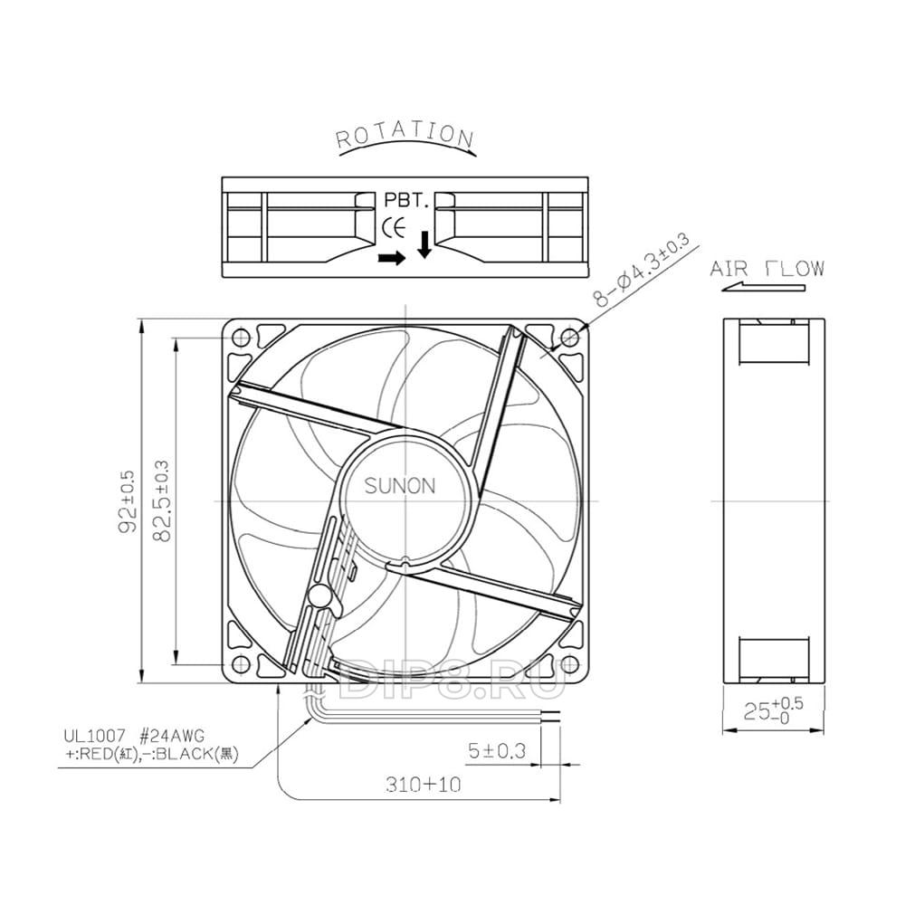 Вентилятор SUNON MF92252V1-A99-A – осевой вентилятор с двумя проводами длиной 310 мм и диаметром 24AWG. Он имеет воздушный поток в 87,04 куб.м/ч, статическое давление в 37,3633 Па и уровень шума 34 дБА. Корпус и крыльчатка изготовлены из термопласта. Ток питания составляет 24 В, мощность – 1,92 Вт, минимальное пусковое напряжение – 8 В, максимальное рабочее напряжение – 27,6 В. Тип мотора – бесколлекторный DC, скорость вращения – 3000 об/мин. Вентилятор работает в температурном диапазоне от -10 до 70 °C и имеет сопротивление изоляции минимум 10 Мом.
