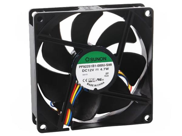 Предлагаем вашему вниманию вентилятор SUNON PF92251B1-S99. Он имеет осевой тип и предназначен для работы в условиях дистанционного управления. Он обеспечивает воздушный поток вместимостью 127,42 куб.м/ч и статическое давление 87,1811 Па. Размеры вентилятора: длина 92 мм, ширина 92 мм и толщина 25 мм. Он имеет качениевый подшипник, уровень шума 47 дБА и работает от DC питания напряжением 12 В и током 0,39 А. Потребляемая мощность составляет 4,7 Вт с отклонением до 15%. Вентилятор оснащен бесколлекторным DC мотором со скоростью вращения 4 500 об/мин и имеет 4 провода длиной 300 мм и диаметром 24AWG. Корпус и крыльчатка выполнены из термопласта. Класс изоляции A, сопротивление изоляции минимум 10 Мом. Минимальная рабочая температура -10°C, максимальная 70°C. В комплекте поставки имеется сигнальный вывод типа F, PWM.
