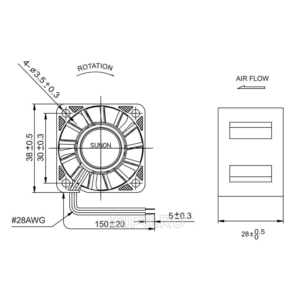 Вентилятор PMD2408PMB1A от производителя SUNON представляет собой осевой вентилятор с воздушным потоком 143 куб.м/ч и статическим давлением 184 Па. Размеры вентилятора составляют 80 мм по длине, 80 мм по ширине и 38 мм по толщине. Он имеет подшипник качения и уровень шума 55,2 дБА. Ток питания вентилятора равен 24 В и мощность 9,6 Вт. Вентилятор имеет бесколлекторный мотор и вращается на скорости 5 700 об/мин. Корпус и крыльчатка выполнены из алюминия и термопласта соответственно. Класс изоляции - B, сопротивление изоляции мин. - 500 Мом. Минимальная и максимальная рабочие температуры составляют -10 и 70 °C. Выводы два, длина провода 300 мм, диаметр провода 24AWG.