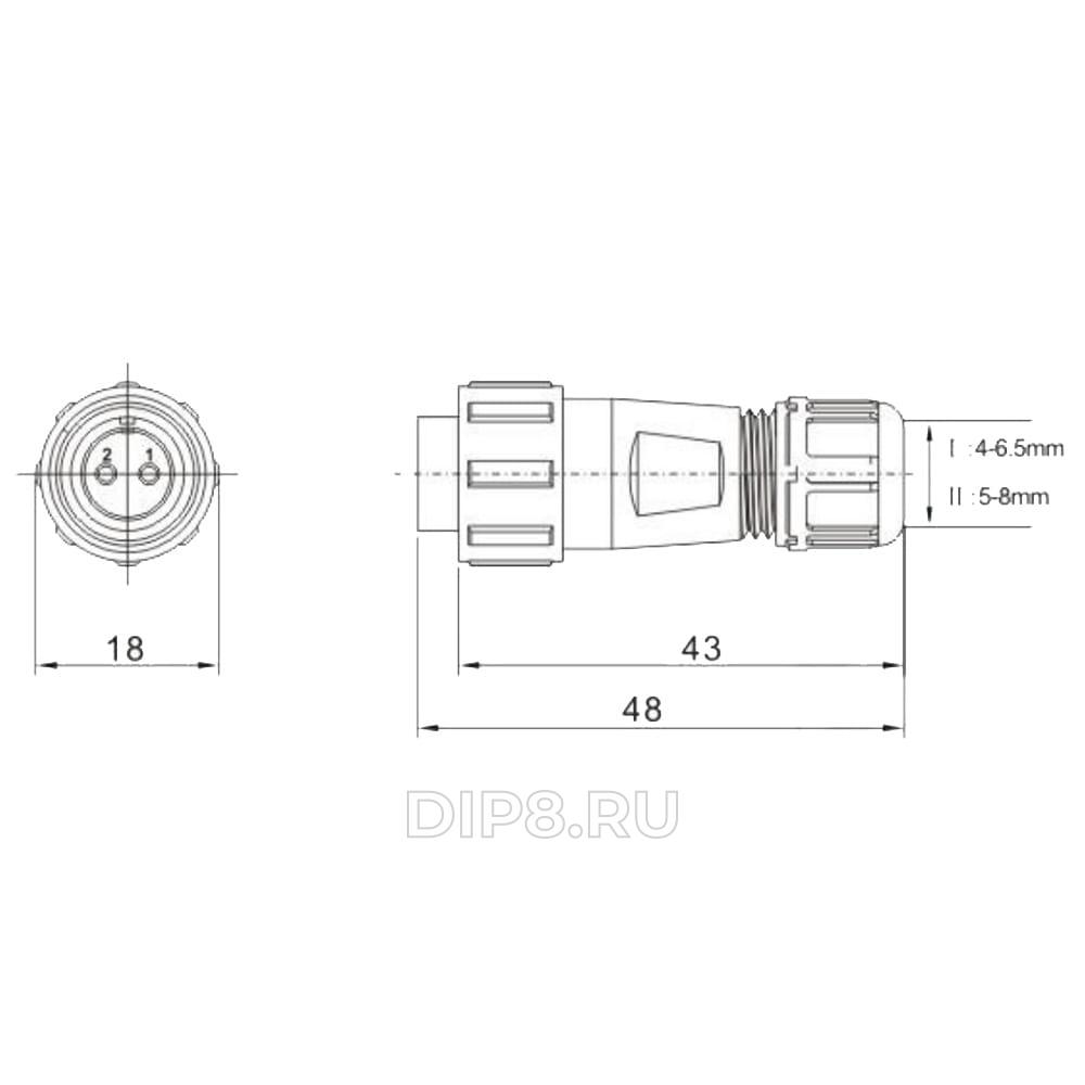 Разъем, вилка, "папа", PIN: 2, IP68, внешний диаметр провода 4-6,5 мм, 13А, 250В, пайка, на провод