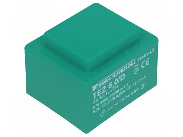 Трансформатор: залитый, 6ВА, 230ВAC, 12В, 500мА, PCB, IP00, 200г