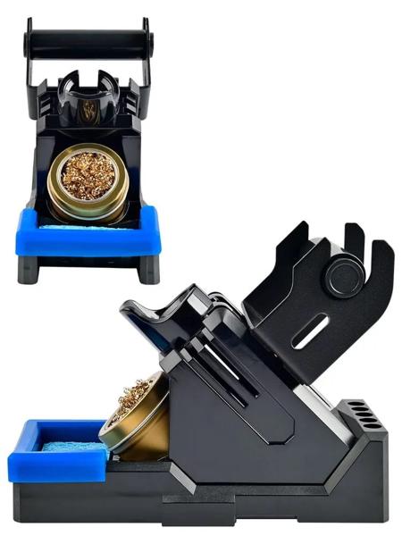 Подставка под паяльник: возможность установки катушки припоя; пять отверстий для хранения паяльных жал; комплекте подставка для паяльника - 1 шт.; целлюлозная губка - 1 шт.; канифоль - 1 шт.; металлическая губка для очистки жала - 1 шт.; уцененный товар: помята упаковочная коробка